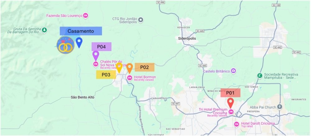 Escolhemos esses lugares com carinho, pois vamos disponibilizar um transporte (ônibus/minivan) que passará por eles tanto na ida para a cerimônia/recepção quanto na volta da festa.